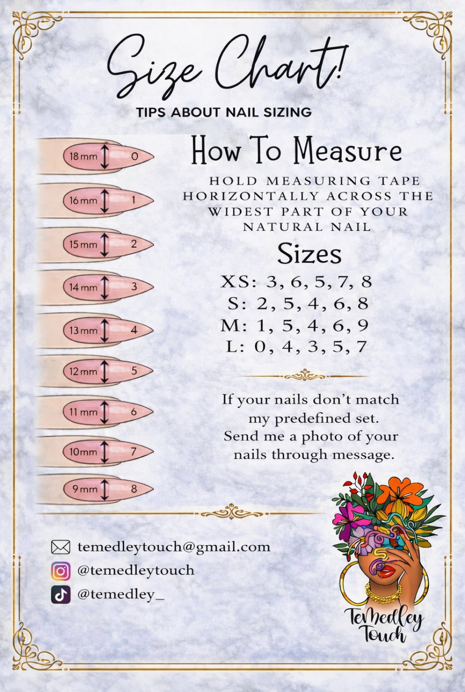 Hold measuring tape horizontally across the widest part of your natural nail. If you don’t have measuring tape , just place the tape over the widest part of your nail, and mark where your nail meets the skin. Then place it over ruler to get measurements.
