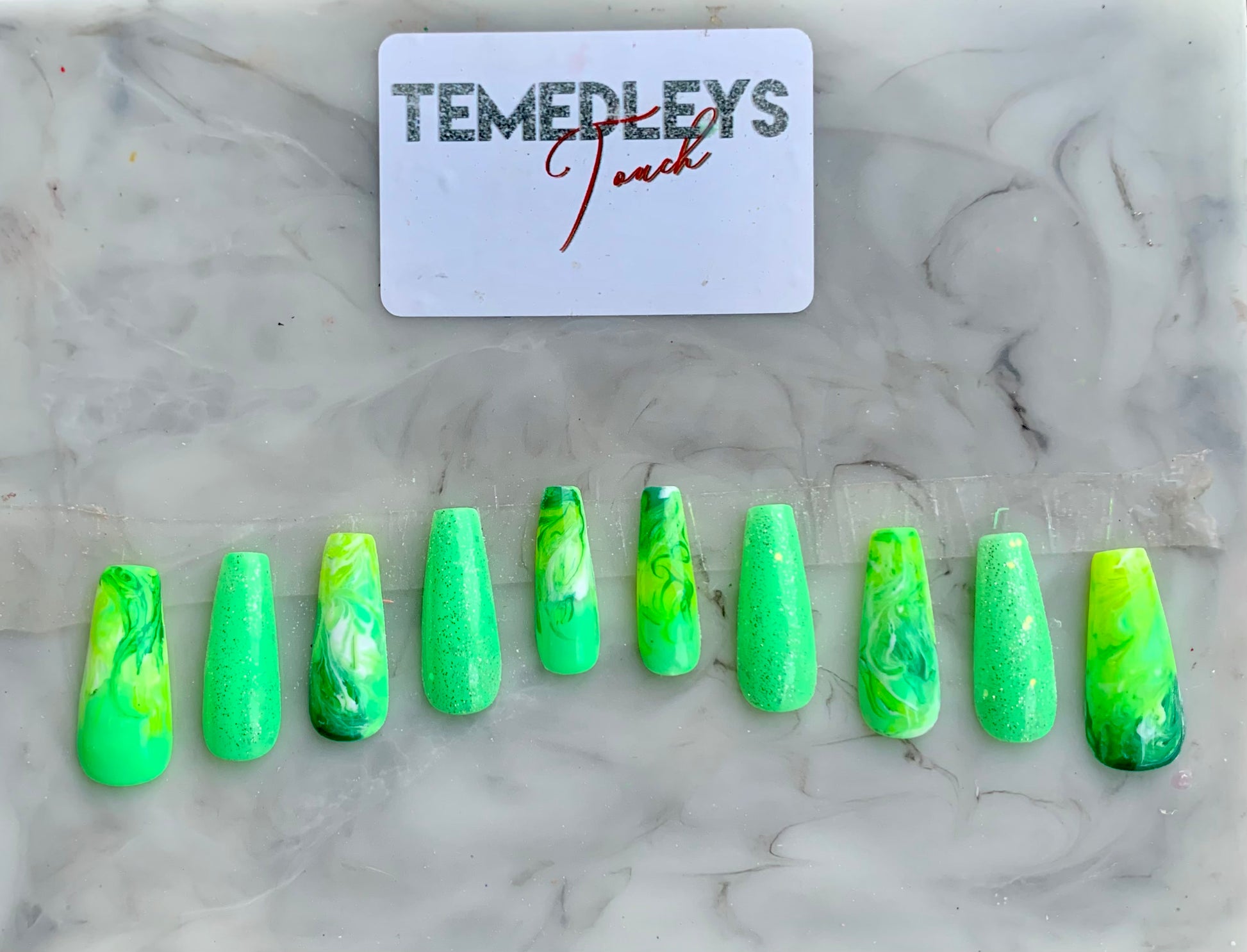 Neon green press on nails / nail art / coffin nails / marble nails / gel polish / glitter nails / gloss finish