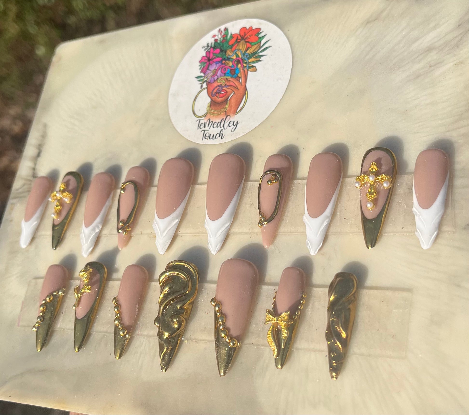2xl stiletto press on nails / French tip nails / 3d gel nails / gold chrome nails / dark nude nails / gel polish / bling nails / gloss finish